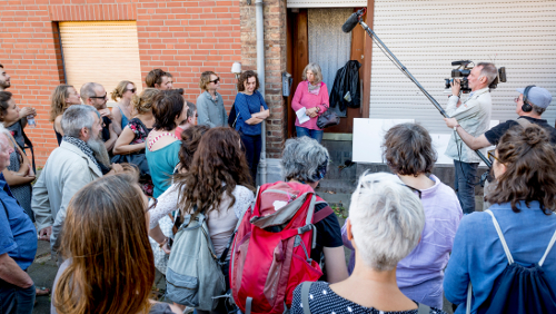 Unter der Leitung von Jörg Fürst (Atonal Theater) und Rosi Ulrich (theater51grad) lauschten die Mitreisenden zunächst einem Audio-Feature (Bassem Hawar) über Utopien, der menschlichen Beziehung zu urbanen Räumen und der Beschleunigung der Gesellschaft. Basis der Exkursion war die Foto-Reihe „Revier“, in der Matthias Jung die vom Braunkohletagebau vertriebenen Städte und deren BewohnerInnen porträtierte. Ein herrlich warmer Tag im goldenen Oktober, eine entspannte Stimmung und eine bizarre Mission: Orte aufzusuchen, die dem Untergang geweiht sind. So ging es hierbei weniger um Theater als um Zeitgeschehen, um Kunst, die näher am Menschen ist als so manche Berichterstattung. Als Guide dieses einzigartigen Projekts stellte sich Hubert Perschke vor. Der Fotograf und Aktivist der Initiative „Buirer für Buir“ dokumentiert die Geschehnisse am Abbaugebiet als Beobachter und ist durch seinen Wohnsitz doch mittendrin.