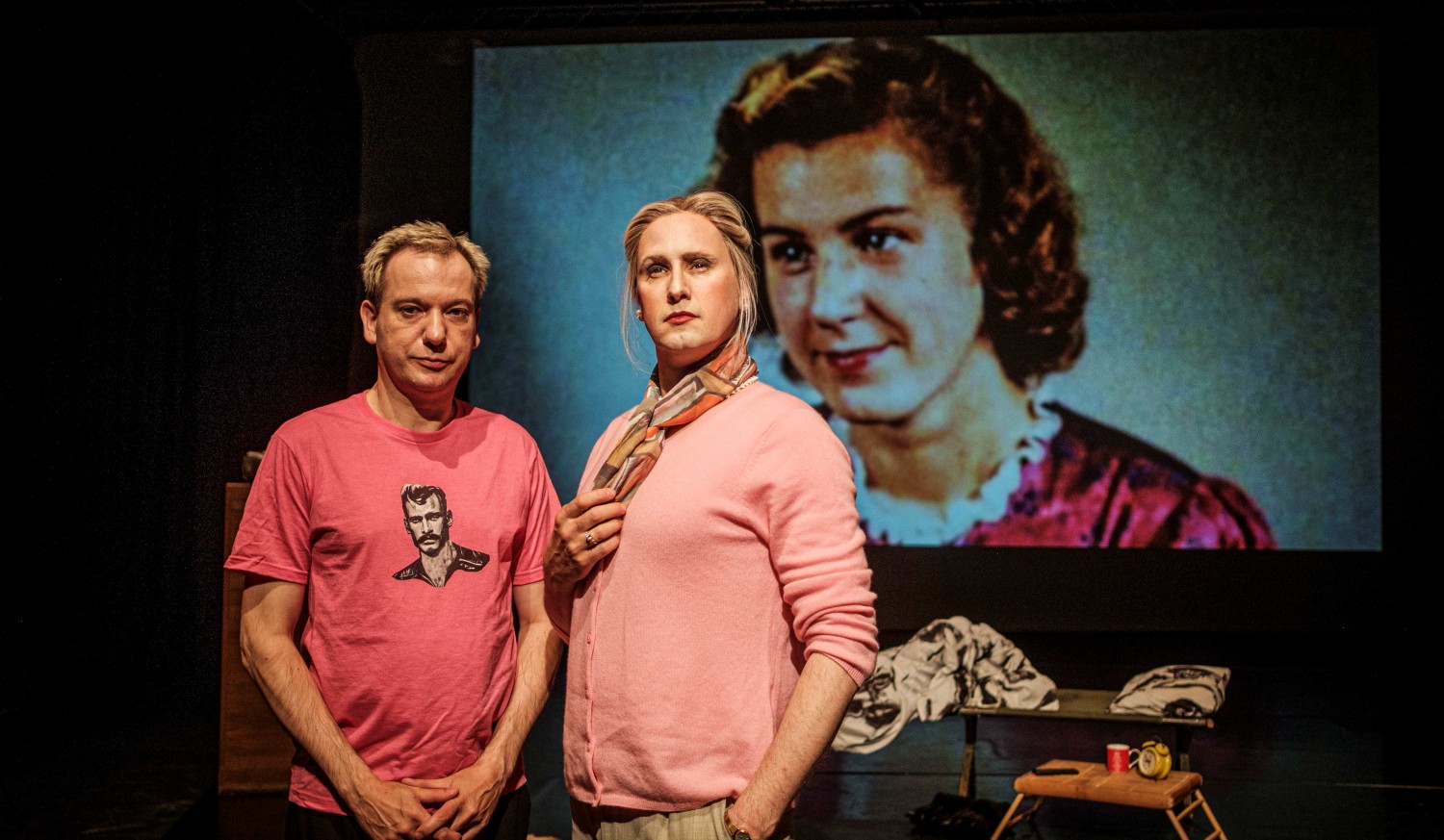 Traudl Junge war Hitlers Sekretärin - in jungen Jahren naiv, reflektiert sie im Alter selbstkritisch und geplagt von Schuldgefühlen ihre Verstrickung in moralisch dunkle Gefilde. Daniel Breitfelder (ausgezeichnet mit dem Kölner Darsteller*innenpreis) stellt sie und ihr Ringen mit den Schatten der Vergangenheit eindrucksvoll dar. Darüberhinaus entdecken er und Sebastian Kreyer auf der Bühne nach und nach aber auch die Risse im eigenen Lebensentwurf, wenn es um moralisch gute Lebensführung geht; immer mehr treten die kleinen Lügen, Verstellungen und Ungereimtheiten zum Vorschein, die die Beiden selbst von einem „guten“ Leben trennen. Zumal als Theaterschaffende, denen es in dieser „moralischen Anstalt“ doppelt schwer fällt, sich gänzlich ohne Zynismus zu bewegen.