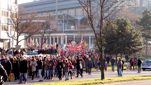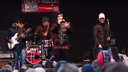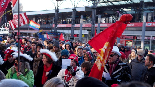Es war kalt unter dem blauen Himmel. Zur Kundgebung „Du bes Kölle“ gegen Rassismus, Fremdenfeindlichkeit und Rechtsextremismus versammelten sich am vergangenen Sonntag ab 13:45 Uhr rund 15.000 Kölner zu Getrommel hinter dem Bahnhof auf dem Breslauer Platz. Parteien und Vereine ließen ihre Fahnen sehen: Schade nur, dass keine Partei rechts von den Grünen wirklich ins Auge fiel. Nach einer Eröffnungskundgebung marschierte die Menge hinter den Perkussionisten von Mario Argandona geschlossen zur Turiner Straße, wo auf Höhe des Thürmchenswall eine Konzertbühne aufgebaut war. Aufgerufen zu der Demo hatte die seit 1992 bestehende Musiker-Initiative „Arsch huh, Zäng ussenander“ nach der beängstigenden „Hooligans gegen Salafisten“-Demo auf dem Breslauer Platz am 26. Oktober, bei der Polizisten angegriffen wurden.
