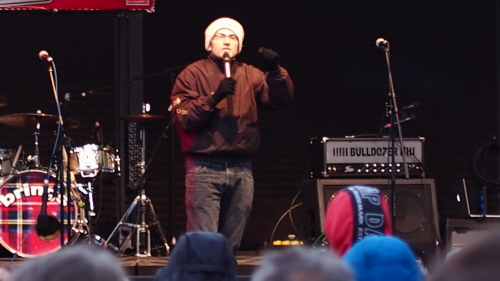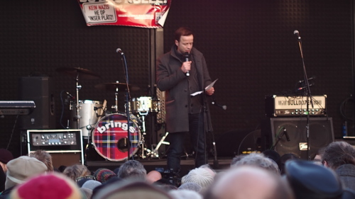 Der Publizist Martin Stankowski, der zusammen mit Shary Reeves moderierte, versuchte in seiner Begrüßungsrede am Bahnhof, sich inhaltlich mit den Parolen der Hooligans auseinanderzusetzen, und zeigte, dass man mit solchen Versuchen schnell an Grenzen stößt: Die Hooligans mit ihren Parolen vom „deutschen Boden“ und ihren Hitlergrüßen legten eine sehr vereinfachte Weltsicht an den Tag. Sie würden sich als „patriotische Europäer“ darstellen, aus deren Reihen aber doch immer nur gegen die EU gestimmt würde. Ihr Verständnis vom „Abendland“ ginge völlig an dem vorbei, wofür das Abendland wirklich stehe. Viel mehr als eine „Generalverbitterung“ sei inhaltlich nicht auszumachen. Von Frau Merkel sei dazu wenig zu hören gewesen, auch die Anti-Flüchtlingsdiskussion ignoriere sie. (Seit Sonntag hat Merkel aber die Pegida-Aktionen erneut verurteilt.) Es sei gut, dass Deutschland ein Einwanderungsland sei, sagte er mit Verweis auf die Ergebnisse der Studie zur Migration, die die Bertelsmann-Stiftung in Auftrag gegeben hatte und laut der die Sozialkassen von Migranten profitierten. Er beklagte die Abstumpfung gegenüber Flüchtlingsschicksalen und die europäische (und deutsche) Entscheidung gegen die Operation „Mare Nostrum“ der italienischen Marine, die zigtausende Leben gerettet und eigentlich den Friedensnobelpreis verdient habe. Nachdem Stankowski an die Herkunft der Namen „Breslauer Platz“ und „Turiner Straße“ erinnerte, sang der schwul-lesbische Chor „Stimmfusion“ zunächst das Kölner Lied „Unsere Stammbaum“.