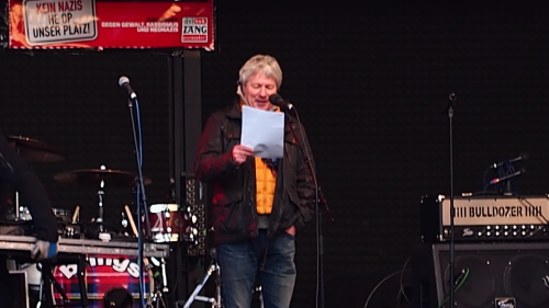 Reiner Schmidt von „Köln stellt sich quer“ rief alle, die Zeit hätten, dazu auf, den Marsch der Pegida/Bogida in Bonn am Montag zu verhindern. Daneben kritisierte er eine der neuen Song-Strophen des Nachmittags, die links und rechts quasi auf eine Stufe stelle. Andreas Kosinski von der antifaschistischen Initiative „Kein Veedel für Rassismus“ berichtete, dass es gelungen sei, den Pro-Köln-Wahlkampf zu behindern, indem man u.a. immer wieder zu den Wahlständen gegangen sei und die Flugblätter in braune Müllsäcke gepackt hätte. Die Coloniacs (Ultras 1. FC Köln) bedauerten den Fußballbezug der Hooligan-Szene, sahen Versäumnisse und bezeichneten das Stadion als einen „Spiegel der Gesellschaft“. Für rechtes Gedankengut und Panikmache wollte Coloniacs-Sprecher Eike Wohlgemuth im Stadion keinen Platz bieten. Die Zeltinger Band spielte „Müngersdorfer Stadion“. Auch die Stunksitzung war vertreten (aus „Englishman in New York“ wurde ein stimmungsvoller „Turkish Prinz in Cologne“), Kasalla sang noch den sich mit rechtem Gedankengut auseinandersetzenden Song „Mer sinn alle nur us Fleisch un Bloot“. „En unserem Veedel“ von den Bläck Fööss wurde als Schlusshymne gewählt. Im Großen und Ganzen hatten die Künstler und Redner den Anwesenden aus dem Herzen gesprochen, man merkte es am zustimmenden Applaus und an der ungeheuren Aufmerksamkeit, die die Menschen an diesem Nachmittag der Bühne schenkten.
