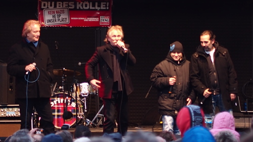 Wolfgang Niedecken, BAP-Sänger und 1992 Textautor von „Arsch huh“, sang „Wellenreiter“, einen über 30 Jahre alten Song über „Jugendliche auf der Suche nach Identität“. Es könne dabei schon mal vorkommen, dass einer auf dem Holzweg lande. Die Muslimin und Islamwissenschaftlerin Lamya Kaddor zeigte kein Verständnis, für diejenigen, die sich Pegida anschließen. In Deutschland gebe es 4,5 Mio. Muslime, und es ginge nicht, dass Leute wie der Innenminister öffentlich Verständnis für so eine Bewegung heuchelten. Salafisten seien auch für Muslime gefährlich, aber auch nicht schlimmer als die andere Seite der Medaille: Islamhass. Tommy Engel war froh, dass man in so kurzer Zeit so viele Leute habe aktivieren können: Die Rede war gegen drei Uhr von über 16.000 Menschen. Er sang „Du bes Kölle“. Brings und Eko Fresh sangen „Es brennt“, ein Lied über den Nagelbombenanschlag in der Keupstraße, die Höhner danach zusammen mit der Microphone Mafia „Der Opportunist“ als einen gegen Mitläufer gerichteten Anti-Gewalt-Song. Arno Steffen spielte mit Kasalla „Arsch huh, Zäng ussenander“.