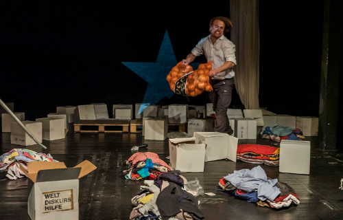 Leky prangert den Unsinn vieler Entwicklungsprojekte an, wo teure Maschinen oder Fahrzeuge unbrauchbar werden und verrotten, weil sie nicht gewartet werden, oder ihnen kleine, lebenswichtige Teile gestohlen werden. Nur wenig Hilfe kommz bei der Basis an, weil zu viel fehlgeleitete Organisation oder Bereicherung mitschwingt. Zum Schluss quält Leky sich in einen Haufen Altkleider und lässt sie sich von einigen Zuschauern ausziehen, bis er splitternackt und mitten durch die Zuschauer hindurch das Theater verlässt: „Ich bin schwarz und habe eine große Stärke: ich habe keine Angst.“ Ende eines großen Theaterabends, mit einem überragenden Darsteller. Trotz des nicht einfachen Sujets und der langen Zeit, gibt es übergroßen Jubel für das Produktionsteam.
