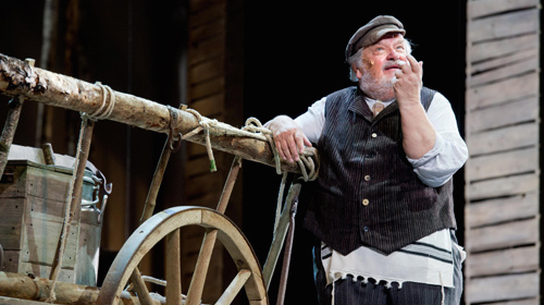 Nach Jahren künstlerischer Musical-Stagnation, kommt die Oper Bonn nun mit Karl Absengers Inszenierung des Genre-Klassikers „Anatevka“ steil aus dem Gebüsch. Wiekaum ein Musical steht und fällt das 1964 unter dem – von einem Bild Marc Chagalls inspirierten – Titel „Fiddler on the Roof“ am Broadway uraufgeführte Stück so sehr mit seinem Hauptdarsteller: Wenn der Milchmann Tevje nicht die Bühne beherrscht, kann man das Ganze vergessen.