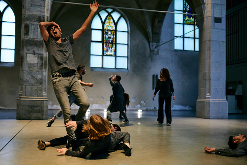 Das Festival stellt deshalb in der von Barbara Wachendorff inszenierten Performance die Frage: Gibt es noch eine Zukunft? Wie können wir die Welt retten? Können wir überhaupt noch an Menschlichkeit glauben? „Wir sind immer zu spät“, flüstern die Laiendarsteller nun bedrohlich, während sie mal Hilfe suchend die Hände in die Höhe strecken, sie dann verängstigt vor ihre Gesichter halten, bevor sie sich einen Kampf liefern. Wie wird er ausgehen? Ist es bereits vorbei?