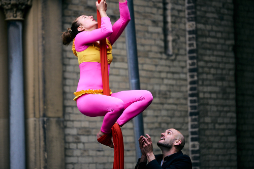 Sommerblut, das Festival der Multipolarkultur, ist traditionell sehr abwechslungsreich. Auch an diesem Abend wandern alle – ob Beeinträchtigung oder nicht – gemeinsam und integrativ in Form eines Rundganges von Ort zu Ort. So lauscht das Publikum an anderer Stelle einem skurrilen Gespräch eines sich im Trennungsprozess befindlichen Paares, worin es um das Thema „Freiheit“ und den Verzicht auf sie geht. Während die Frau wortwörtlich äußerst unfrei an einem Seil hängt und nur noch fliehen möchte, entgegnet ihr Mann romantischerweise, die Hauptsache sei doch, dass sie funktioniere. Als sie sich von ihm trennen möchte, wird sie charmant als Müll entsorgt. Denn schließlich spurt sie nicht mehr.