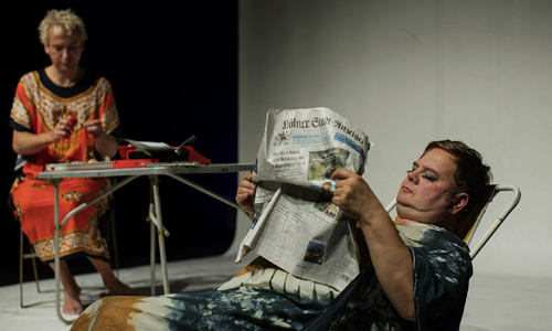 Am Anfang ist da noch die Ruhe vor dem Sturm. Oder nach dem Sturm, wie man´s nimmt. Matthias Buss als Trude Herr, das Gesicht verdeckt von einem riesigen Strohhut, der Vergangenheit und der alten Heimat Köln nachsinnend, steht in ihrem Exil auf den Fidschi-Inseln. Sebastian Kreyer, Regisseur und schauspielerisches Gegenstück in Personalunion, taucht in seiner ersten Rolle auf: als Möwe. Buss geht auf sie zu, doch die Möwe schreckt zurück. Selbst hier misslingt die Integration. Auch auf den Fidschis bleibt Trude Herr vor allem eines: eine Außenseiterin.